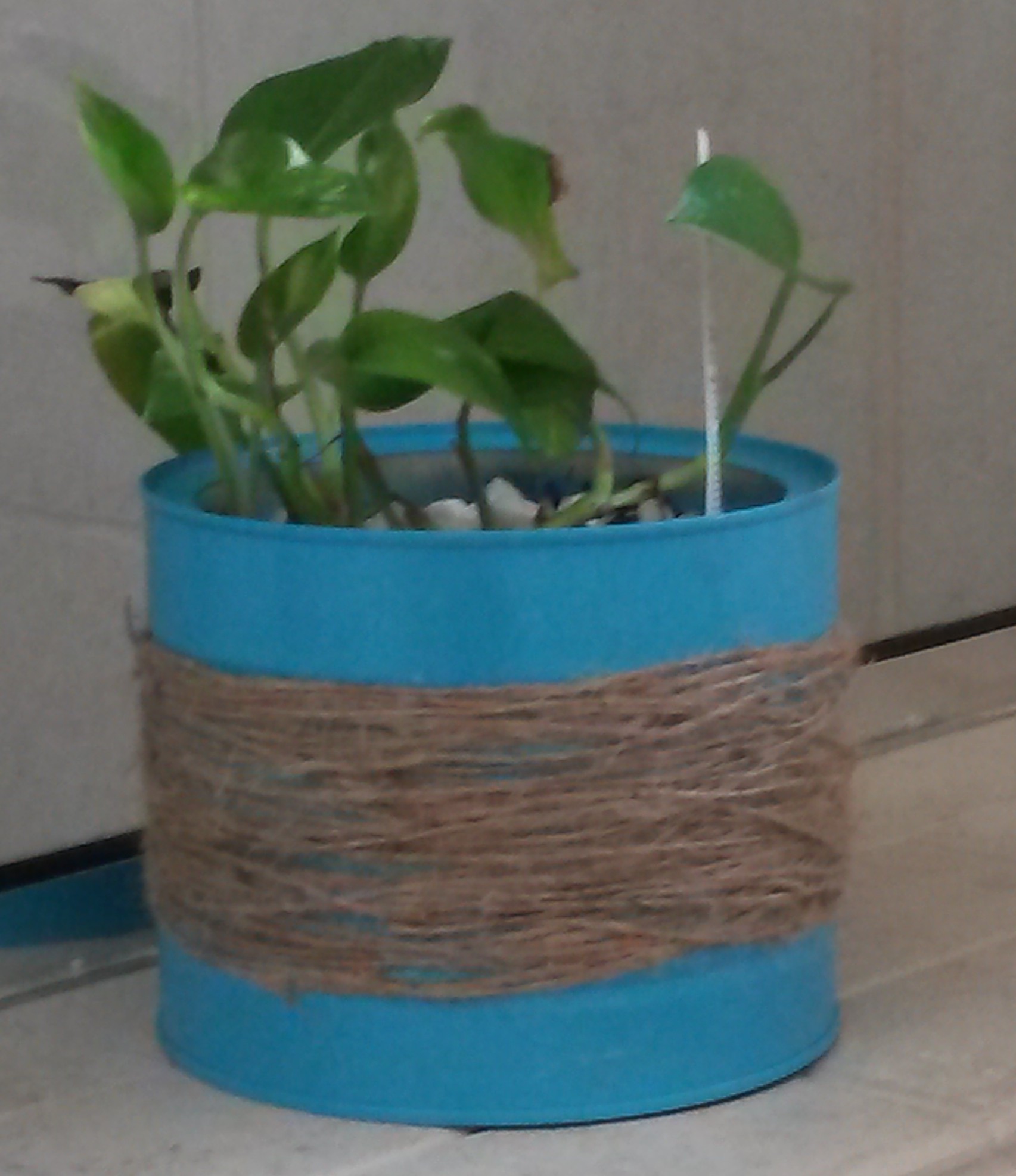 I had an indoor plant that needed a home. That same week my husband finished the big tin of salted nuts he had purchased at Costco. A couple of spray paint coats later, I had an elegant and inexpensive solution to my problem.