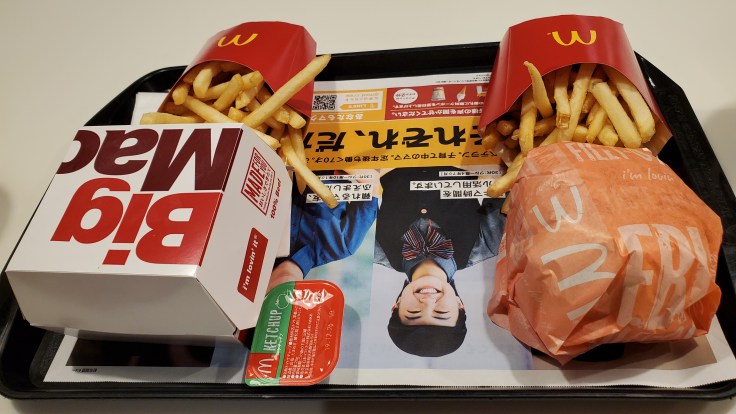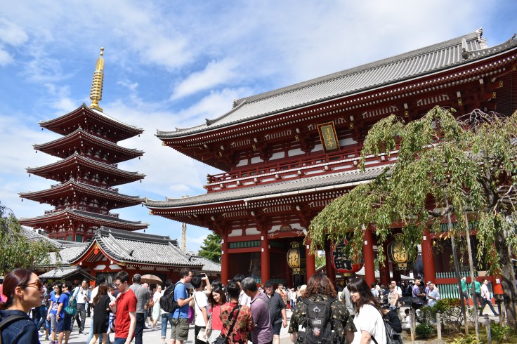 It was one of the best vacation days we have had thus far. To next morning, to keep up with the itinerary, we hoped back on the metro and headed to Asakusa where the Senso-ji and its shrine welcomed us along the rugby crowds rooting for Ireland and Scotland. In between the kilt wearing fans, we stopped at a McDonald’s to try the Ebi burger and a Big Mac; a family tradition dating back to our Barcelona trip. (The original tradition started when my mom made my sister and me eat at the Paris establishment to save some cash in a very eventful graduation trip through Europe in 2004.) The shrimp or ebi burger was delicious! The day was really on a good roll. Woohooo! Hopefully the trip to Osaka the next day would continue to add to the fun.