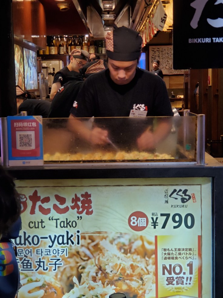 The goal of residents and tourist in Dotombori is to eat until you drop, or until you are broke. The main specialty is Takoyaki, a flour ball filled with octopus and veggies (scallions or green onions for example), made in a special divet pan right in front of patrons. Kukuru is the No. 1 spot to enjoy this delicatessen, with a line that can be 50 people long on holidays and weekends. Most of the places accept cash only; come prepared to spend around 5000 yen per person if you are going for the full tasting experience. People often eat sitting on the floor or as they walk, one of the few places in Osaka and Japan where you can do so.