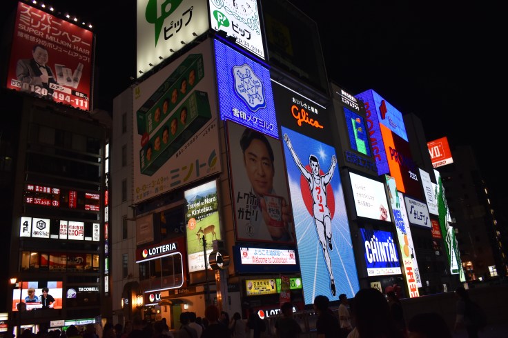 Armed with enough products to last me the trip, and then some, we dropped off the loot and headed to Dotombori in Namba. The station is a mini mall full of cool eateries like Bearded Papas – a pastry creme shop – and many retail outlets. The B14 exit led us to the promenade, a strait shot to the river and the heart of the neon lighted, food front filled, street with a nightlife reminiscent of Las Vegas or Time Square. Once known as the theater section of the city, it has karaoke, Shiba Inu dog cafés, and exhibitions of favorite local characters like Apeach and Hello Kitty.