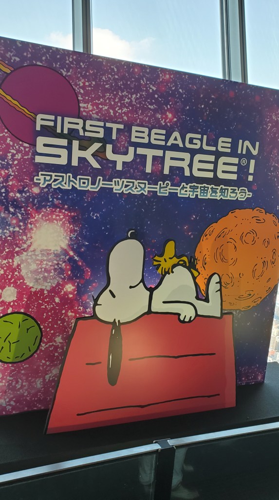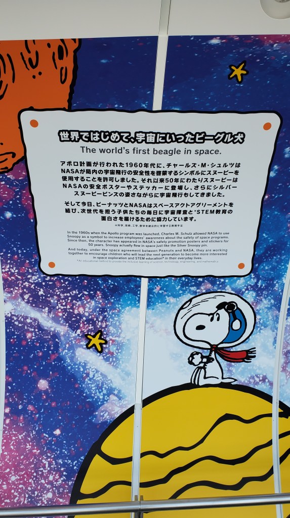 A quick 10 min wait later we were up in the observation deck on floor 350. Due to the overcast weather we couldn’t see the Yokohama Landmark Tower in the distance, nor the elusive Mount Fuji which we hadn’t spotted once for the same reason: visibility. From the Tembo Deck, we boarded the elevator to the Tembo Galleria, an inclined walkway that spirals upwards from floor 445 to 450, the highest point patrons are allowed to visit. The Galleria theme was “First Beagle in Space” an exhibit featuring Snoopy and the Peanuts characters to celebrate the 50th anniversary of the moon landing. Visitors young and old cued up to take pictures with the displays and built in photo ops. Totally awesome!