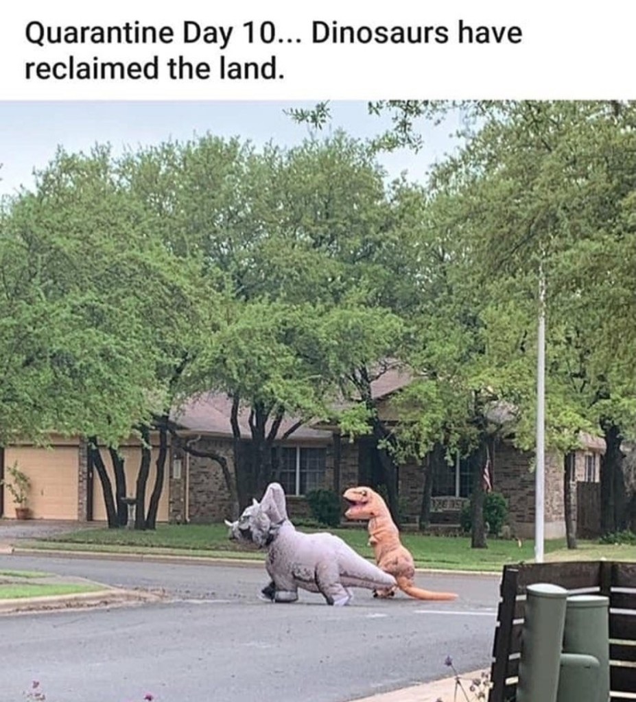 Police patrols enforced new laws and regulations fining those who roamed the street in T-Rex costumes without authorization. A classic literary dystopian present and future developed in front of our eyes through the abject use humor and memes. We became recluses, hermits, vacationers to Puerto Backyarda and Los Living Rooms. Wine and beer tours of the household became the norm. First responders and medical personnel ran out of PPE and ventilators thanks to those who didn’t abide and flooded beaches and parks during Spring Break. Grandmas and grandpas were told to sacrifice their lives to save the economy. It wasn’t fun to watch my plans for my birthday go down in flames.